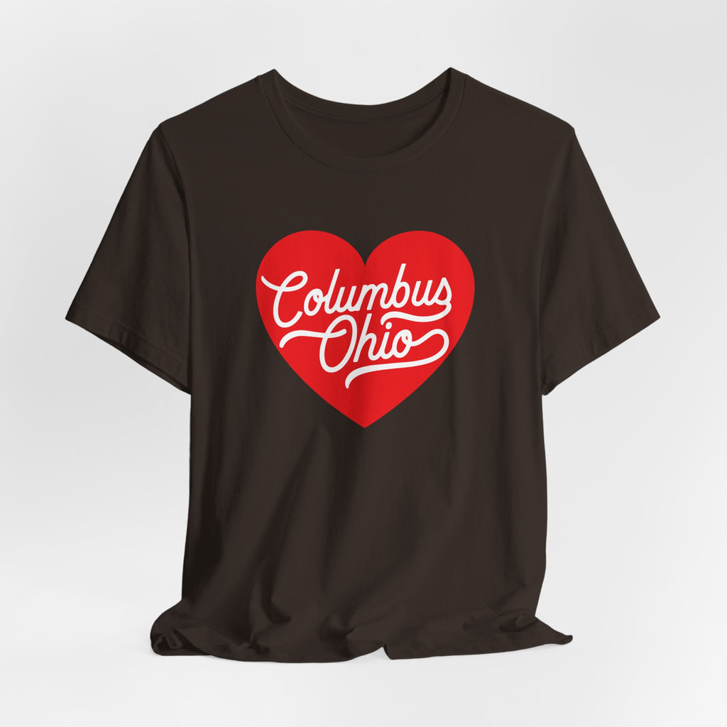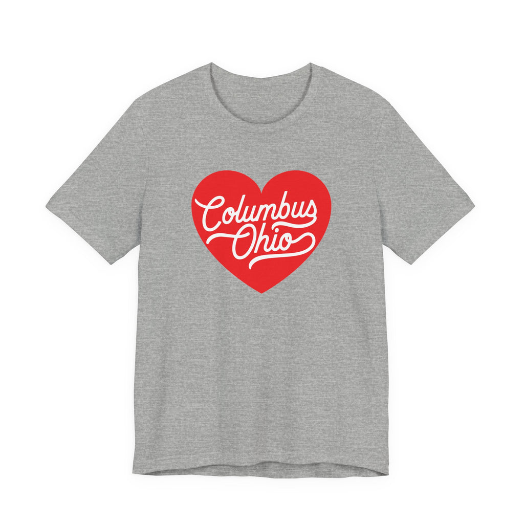 This lightweight, breathable tee brings a warm, hometown heart to everyday wear. Made from 100% Airlume combed and ring-spun cotton (with select heather blends), the retail-fit crew neck and side seams give a neat silhouette that holds its shape. The bold, script heart graphic reads like a hand-lettered love note to Columbus, Ohio — bright, simple, and unmistakable on a clean white canvas. Thoughtful construction details — ribbed knit collar, shoulder tape, and a tear-away label — keep it comfortable for long days around town, at local events, or layered under a jacket for evenings out. Ethically produced and REACH certified, this tee is designed to feel familiar from the first wear and stay that way wash after wash.