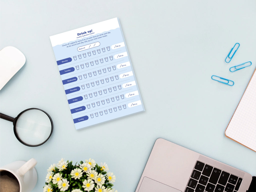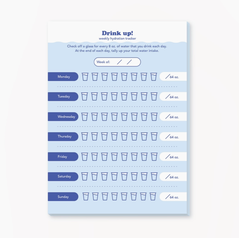 "Drink up!" weekly hydration tracker. Check off a glass for every 8 oz. of water that you drink each day. At the end of each day, tally up your total water intake. Notepad 5" x 7" 25 pages 70 lb. paper Single-sided Cardboard backed Perfect bound