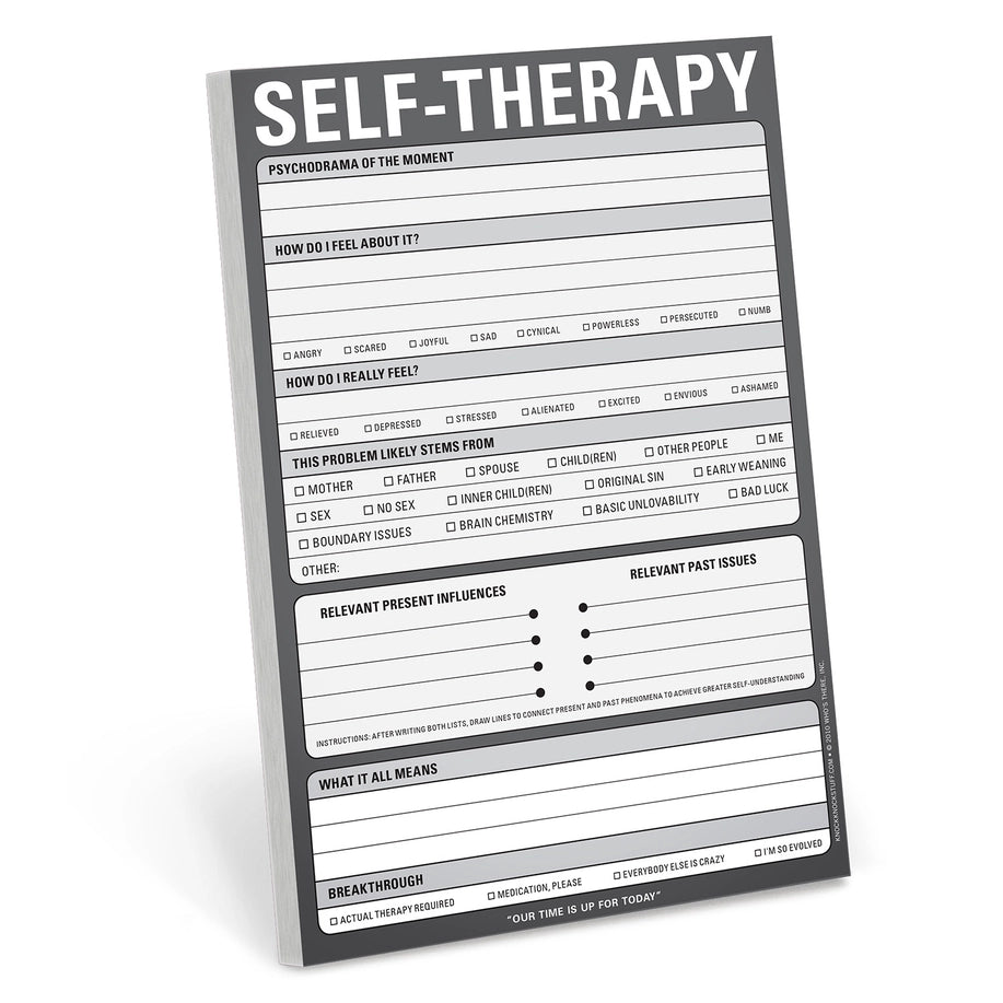 Everyone needs a little help from time to time. With the aid of Self-Therapy, now you can finally help yourself! Whether you feel depressed, anxious, or even perfectly well-adjusted, this step-by-step pad will guide you toward a breakthrough--or at least determine who or what to blame. The perfect gift for friends and family who aren't perfect Checkboxes handily satisfy your inner-child 6 x 9 inches; 60 sheets